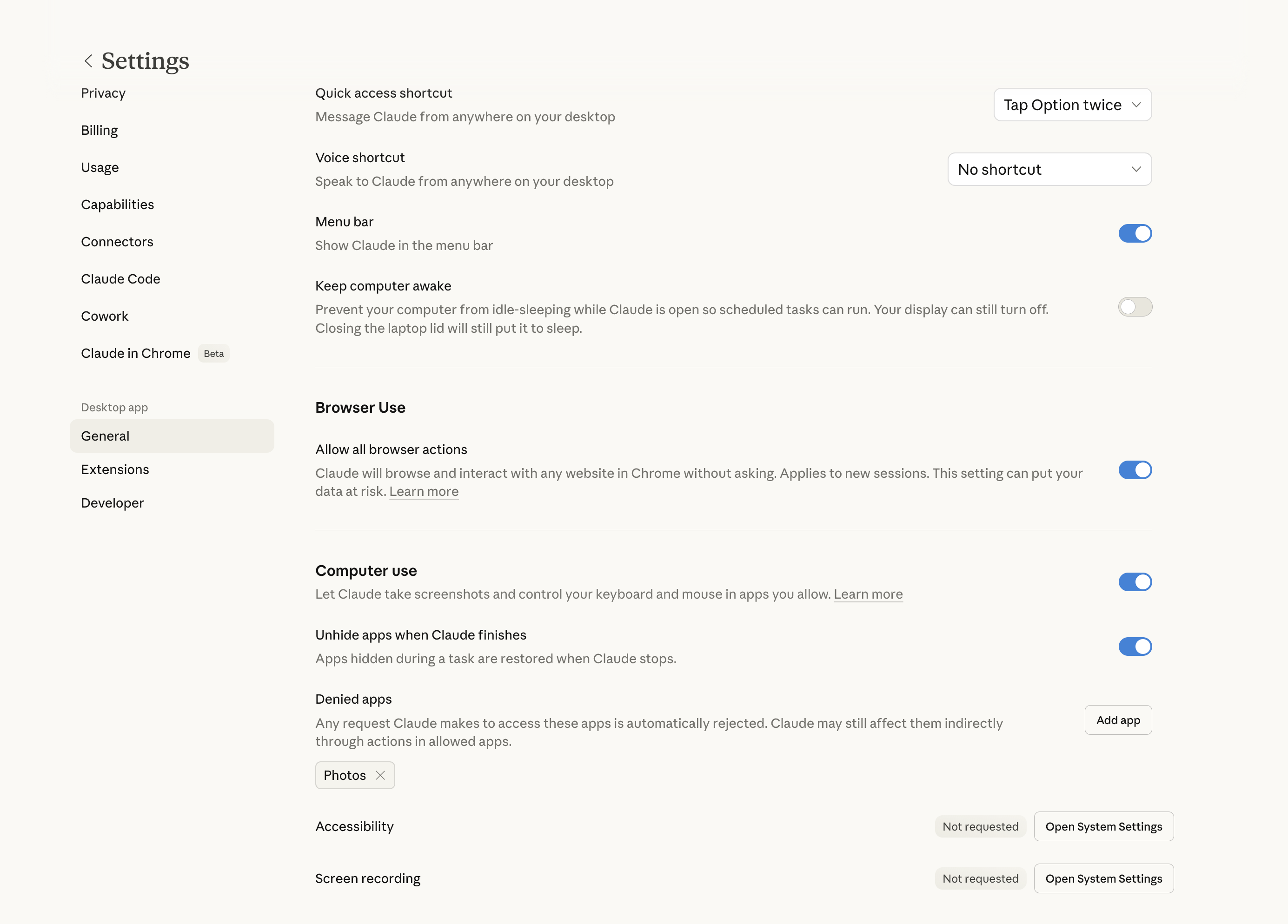 The Accessibility permission on macOS is sandboxed, and it can silently stop working after a macOS update or after Claude Desktop updates. If Claude seems to be running but not doing anything, go back to System Settings, remove Claude from the Accessibility list, and re-add it. That fixes the problem in most cases. If Screen Recording permission doesn’t appear in the prompt, add it manually via the + button in the Screen Recording panel.